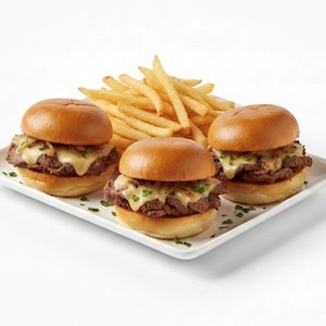 Three Mini Cheesesteak Sliders Stacked With Tender Shaved Steak, Sweet Caramelized Onions and Melted Sharp Cooper Cheese. Served With A Side Of Fries.